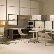 - Sistema de amoblamiento modular con marcos metálicos y tableros removibles.