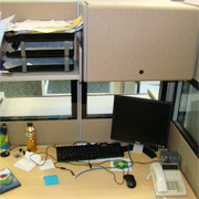 - Sistema de amoblamiento modular con marcos metálicos y tableros removibles.